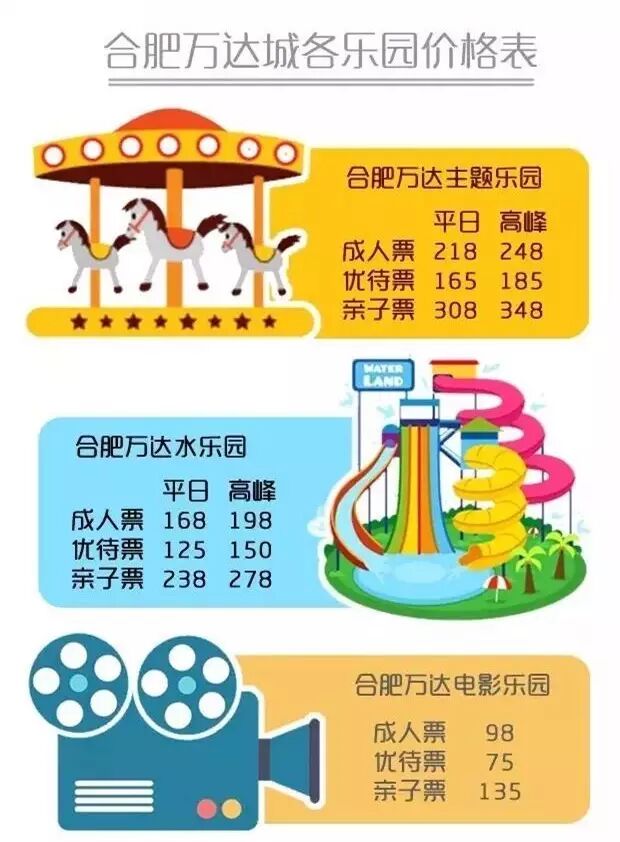 遗产公园成人票58元9:00-21:00欢乐岛成人票80元8:30-17:00阿酋湾水上乐园成人票120元8:30-18:00合肥海洋世界