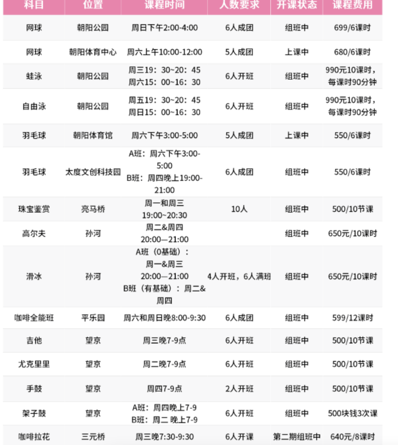 运动类的如网球、游泳、高尔夫、滑冰,音乐类的如吉他、手鼓、架子鼓、尤克里里,生活类的如咖啡拉花、咖啡手冲、中餐制作,甚至还有珠宝鉴赏课、即兴戏剧,收费也各不相同,如中餐制作需要500元/6课时,高尔夫则是650元/10课时,架子鼓相对贵一些,为500元/3课时.