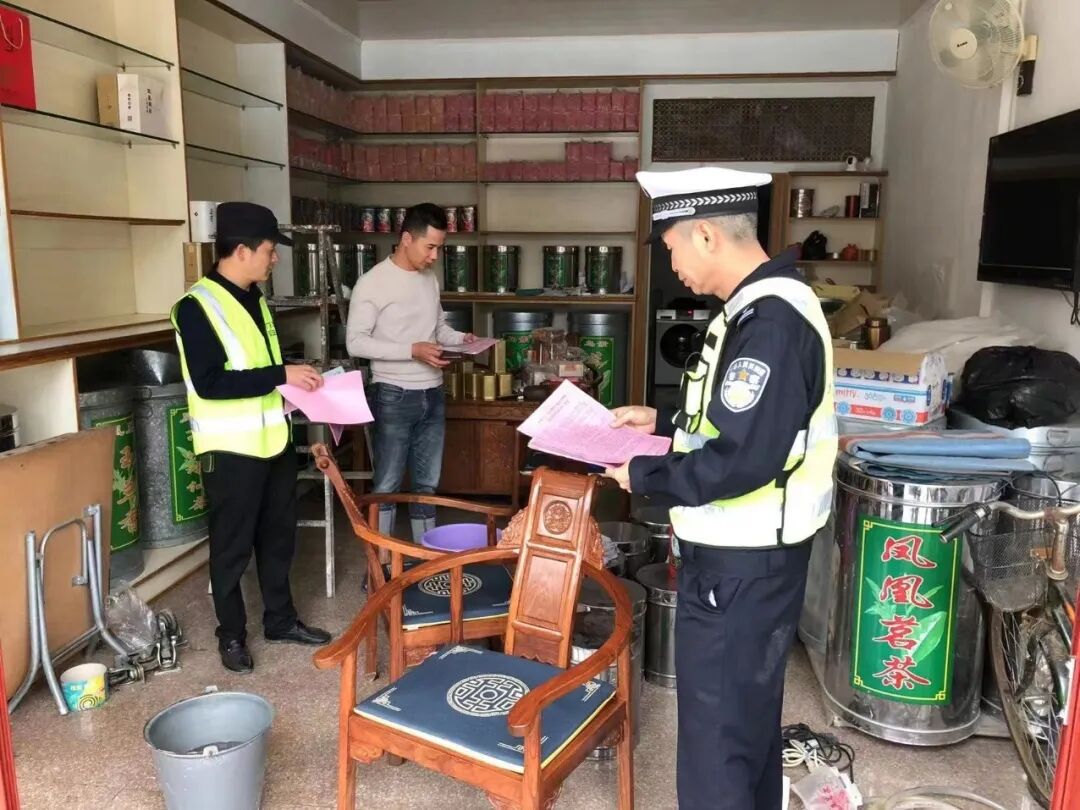宣传民警向沿路家庭、企业派发交通安全资料,提醒“春茶”采摘期间,要配合当地党委、政府,公安交警部门做好道路交通安全防护工作,严禁占道经营、违停乱停以及在公路晒茶叶的行为。