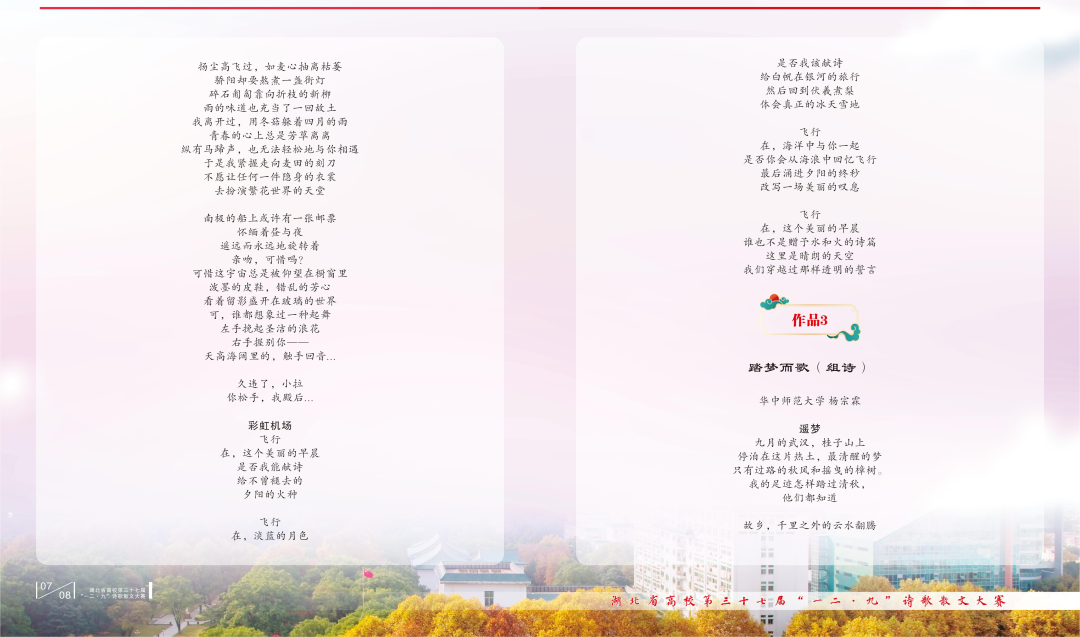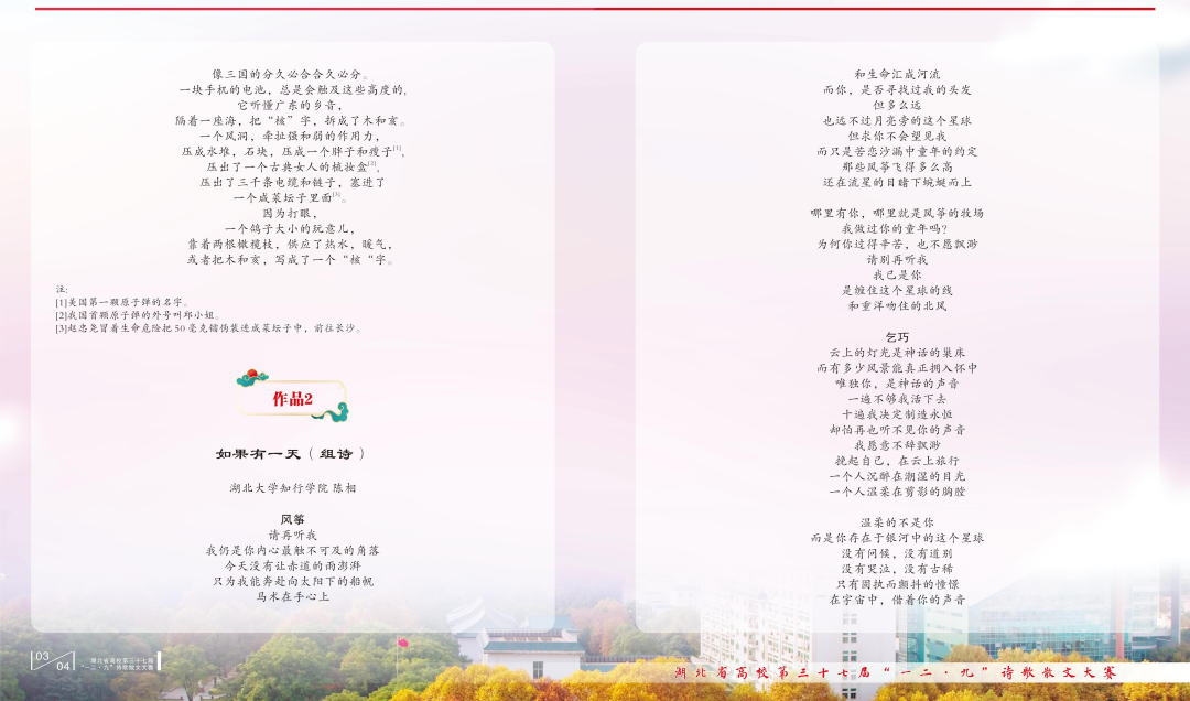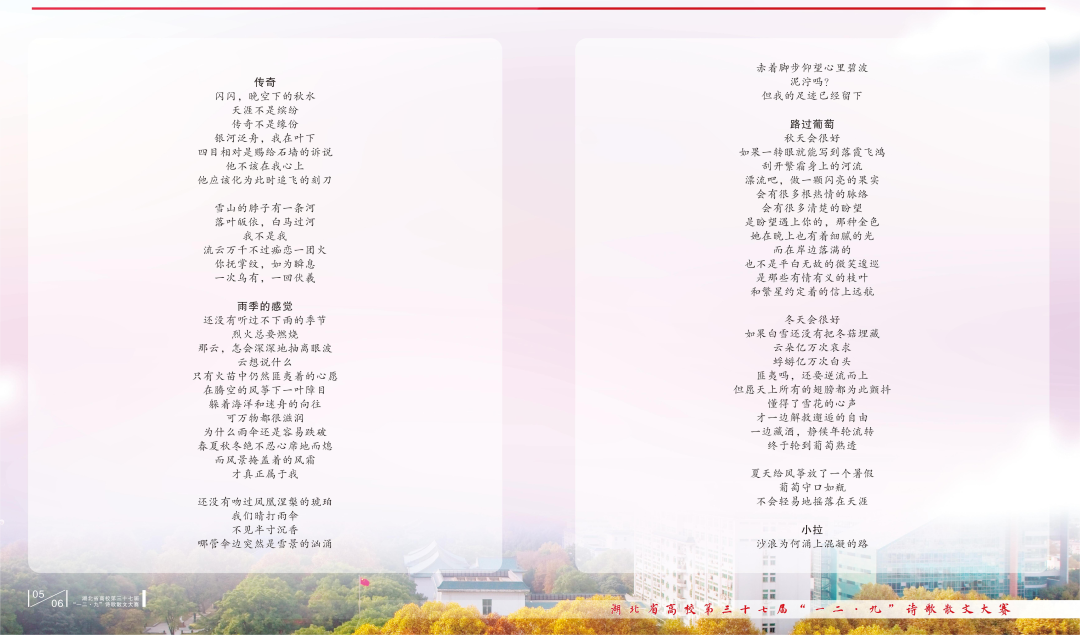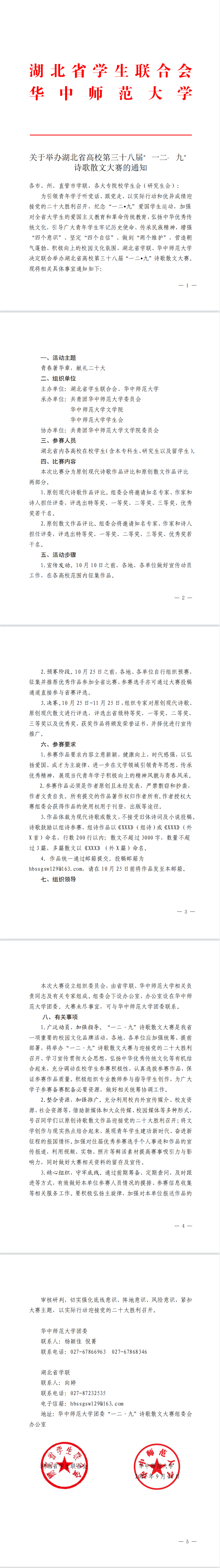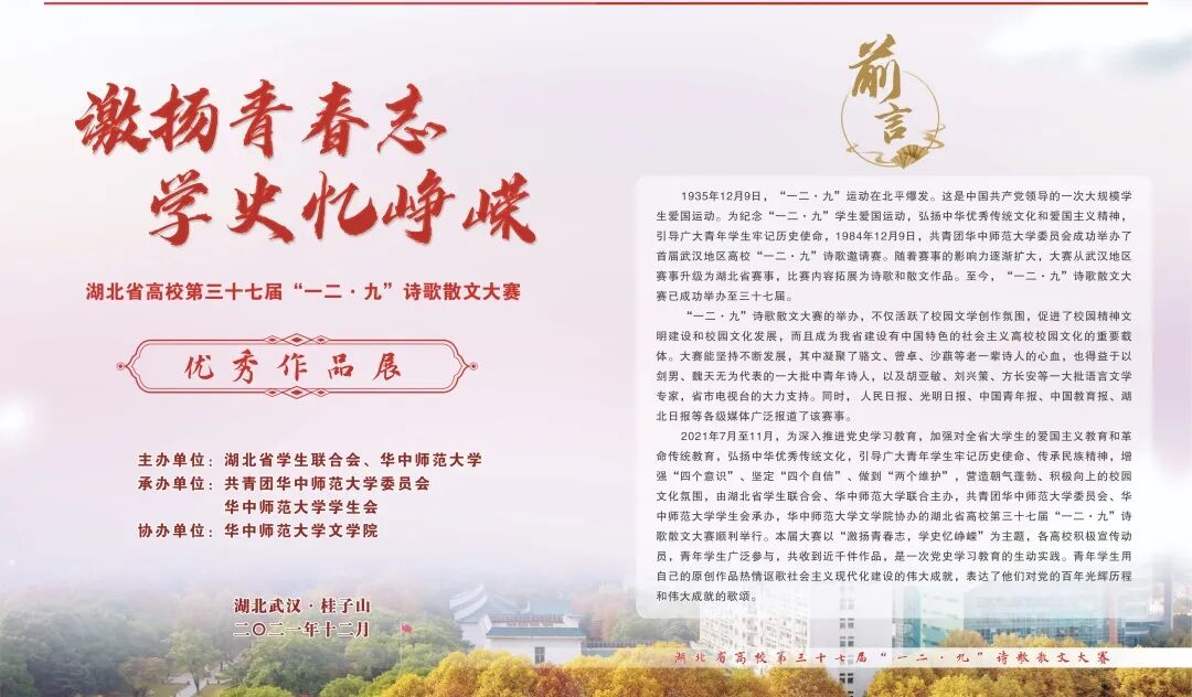 为引领青年学子听党话、跟党走,以实际行动和优异成绩迎接党的二十大胜利召开,纪念“一二•九”爱国学生运动,加强对全省大学生的爱国主义教育和革命传统教育,弘扬中华优秀传统文化,引导广大青年学生牢记历史使命、传承民族精神,增强“四个意识”、坚定“四个自信”、做到“两个维护”,营造朝气蓬勃、积极向上的校园文化氛围,湖北省学联、华中师范大学决定联合举办湖北省高校第三十八届“一二•九”诗歌散文大赛。
