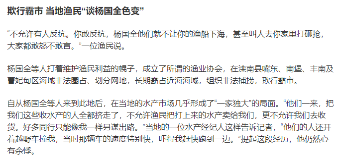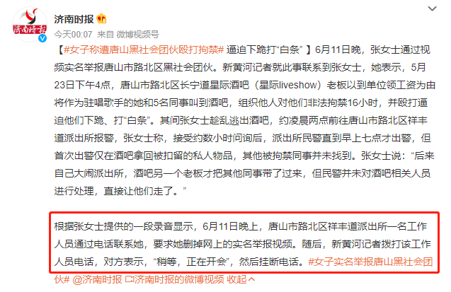 说回唐山烧烤店暴行主犯陈某志,这人绝不只是前科犯这么简单。在2018年年初,唐山警方就曾铲除过一个以杨国全为首的特大黑社会性质犯罪组织。简而言之,就是个“渔霸”——靠暴力手段欺行霸市,在当地水产市场上搞非法垄断。这位“黑老大”在当地扎根长达十几年,直到2018年才在全国扫黑除恶的过程中被打掉。这伙人在当地渔业呼风唤雨了十几年,没有保护伞是不可能的。所以当时侦查的第二个方向,就是杨国全背后的保护伞。之所以要提到杨国全,是因为他与陈某志有微妙的联系。杨国全是2018年被办的,而唐山烧烤店暴行主犯陈某志,则在2018年被列为失信执行人。现在明显当地不止一个杨国全,不止一个陈某志,那么2018年被打掉的62名干部,就是全部了吗?实际上,陈某志被拘后的种种迹象都表明,答案很有可能是悲观的。烧烤店暴行第二天,出现了另外两个事情,变相地揭露了更深层的问题。首先是唐山当地一名蛋糕店老板,实名举报当地黑恶势力。自2021年7月起,这个团伙就持续对其进行威胁恐吓、敲诈勒索、暴力打砸致其蛋糕店关门。在店主不堪其扰,被迫关门后,这帮人还时不时跑到店主家里骚扰闹事。这伙人的目的也很简单,就是索取“保护费”,是非常典型的黑势力行为。而期间店主说自己一直在向上反映,但并没有起到什么效果。直到这次烧烤店打人事发,他乘机再次举报,才终于引起重视。唐山的张女士举报,在今年5月23日下午,唐山市路北区某酒吧老板,以到单位领工资为由将作为驻唱歌手的她和5名同事叫到酒吧。然后就对他们非法拘禁长达16小时,并殴打逼迫他们下跪、打“白条”。又是非法拘禁,显然和黑势力脱不了干系,但这事的魔幻之处还在后面。据说张女士在拘禁期间曾趁乱逃出酒吧,并在凌晨2点报警。可随后她却经历了长达数小时的问话,直到早上7点,在其本人不断要求下,她的同事才终于被带出来。而且那些个涉嫌非法拘禁的酒吧人员也并未受到处理,只是走个过场就被释放了。值得一提的是,在张女士实名举报后不久,就接到某部门电话,要求其删除相关举报视频。不论两人私心如何,只要没说谎,就也为扫黑除恶尽了一份力。因为在他俩的举报中可以发现一个共同的问题——也就是当地黑恶势力猖獗。如果再结合烧烤店施暴9人前科累累却始终逍遥法外的事实,就不难得出“保护伞确实存在”的推论。