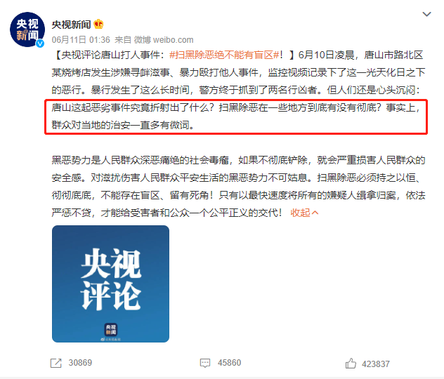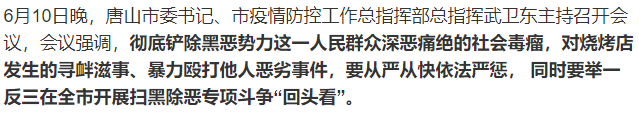 然后提到“群众对当地的治安一直多有微词”,几乎算是肯定了当地黑恶势力猖獗。其次还用两个问题,“唐山这起恶劣事件究竟折射出了什么?扫黑除恶在一些地方到底有没有彻底?”直指“保护伞”问题。也算是正式通告,本次事件已经从纸面上的“扫黑除恶”,变成了关于当地系统的“内部肃清”。案发当晚,当地市委书记就火速表态,强调“彻底铲除黑恶势力这一毒瘤”。