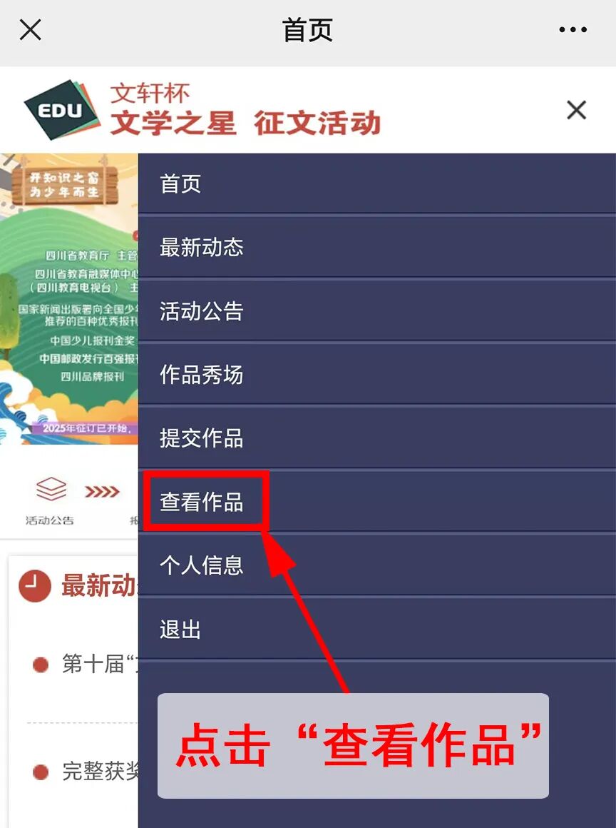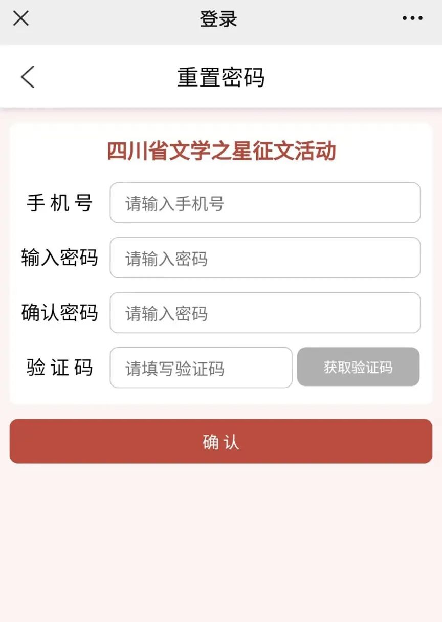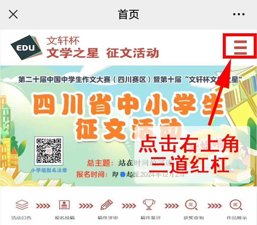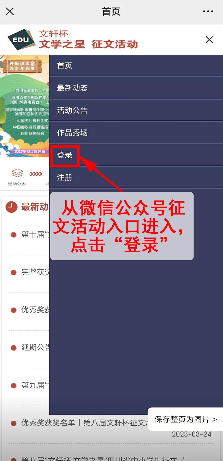 从“少年百科知识报”微信公众号,底部菜单栏的“征文活动”入口,进入“四川文学之星”网站。点击右上角红色三道杠,再点击“登录”,使用注册时填写的手机号和密码登录。