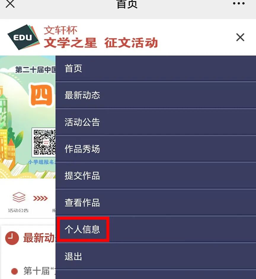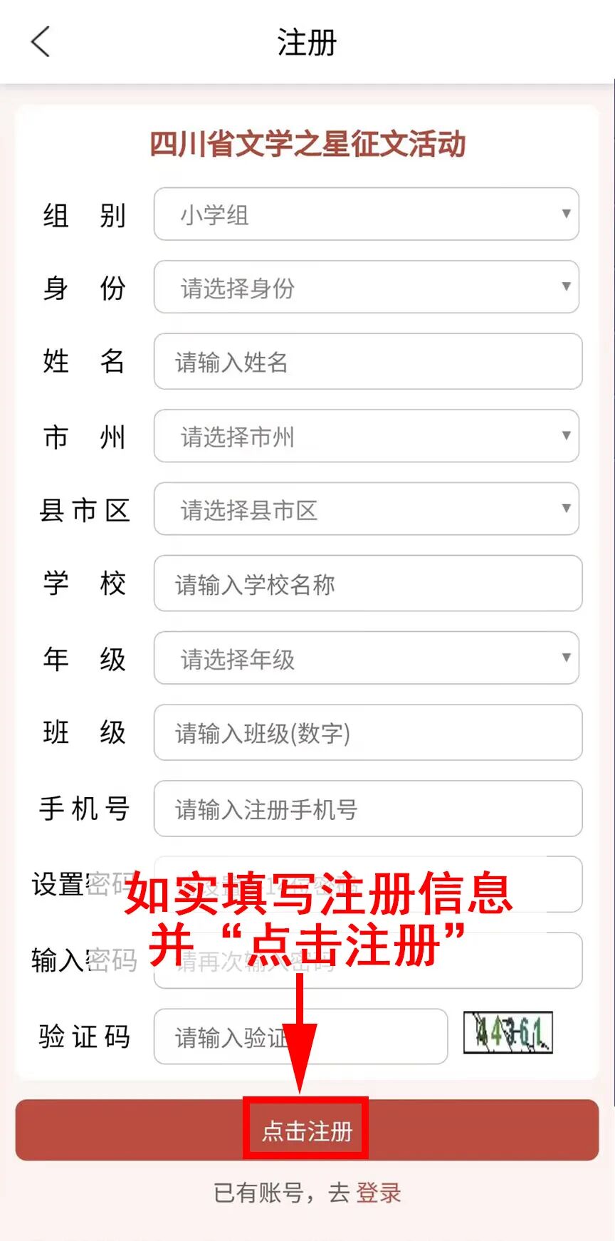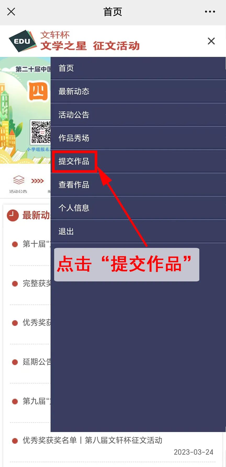 从“少年百科知识报”微信公众号,底部菜单栏的“征文活动”入口,进入“四川文学之星”网站。点击右上角红色三道杠,再点击“登录”,使用注册时填写的手机号和密码登录。