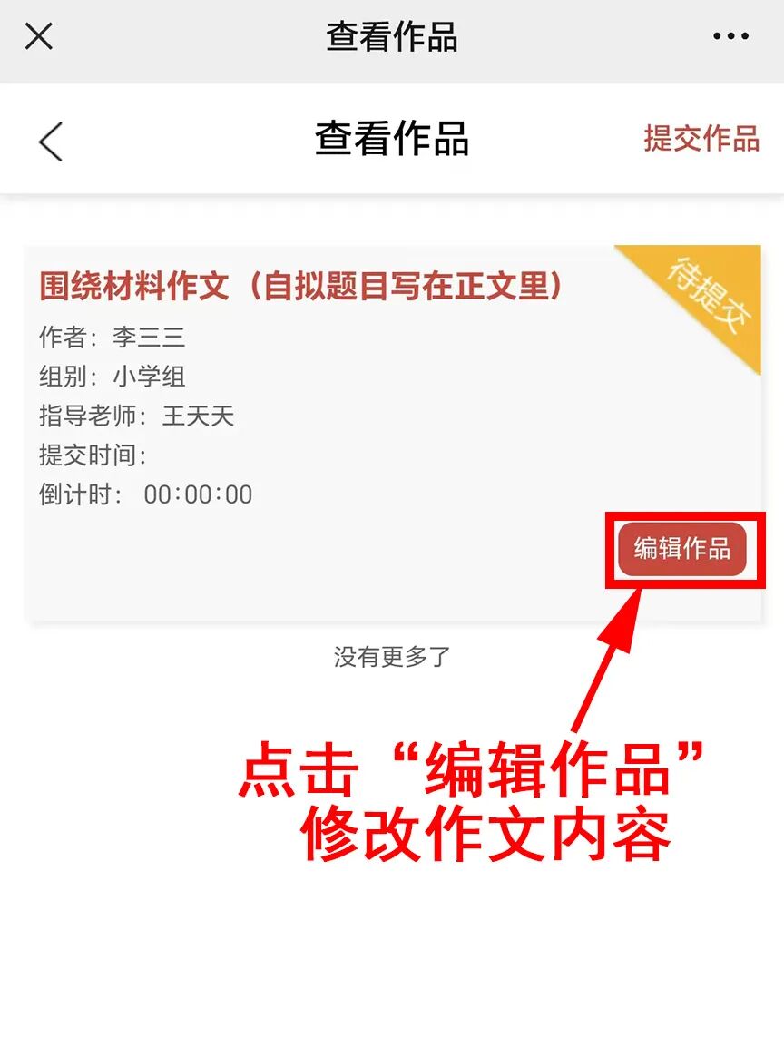 点击右上角“保存”按钮后,可以随时进入征文系统对作文进行修改。重新进入时,点击下拉菜单“查看作品”,再点击“编辑作品”,等修改满意后再上传。