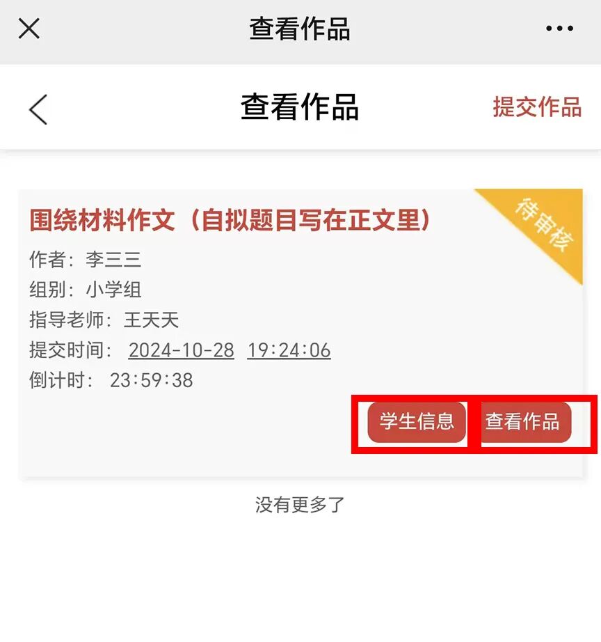 此外,手机端上传作文后,点击“学生信息”或菜单栏“个人信息”,可修改学生、老师等相关信息,点击“查看作品”在24小时倒计时内可修改作文。如在上传作文之前,则只能到电脑端修改该篇作文的学生、老师等信息。