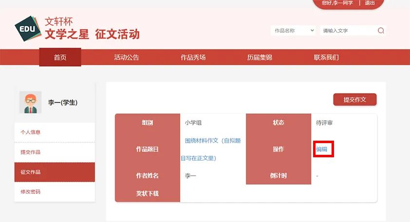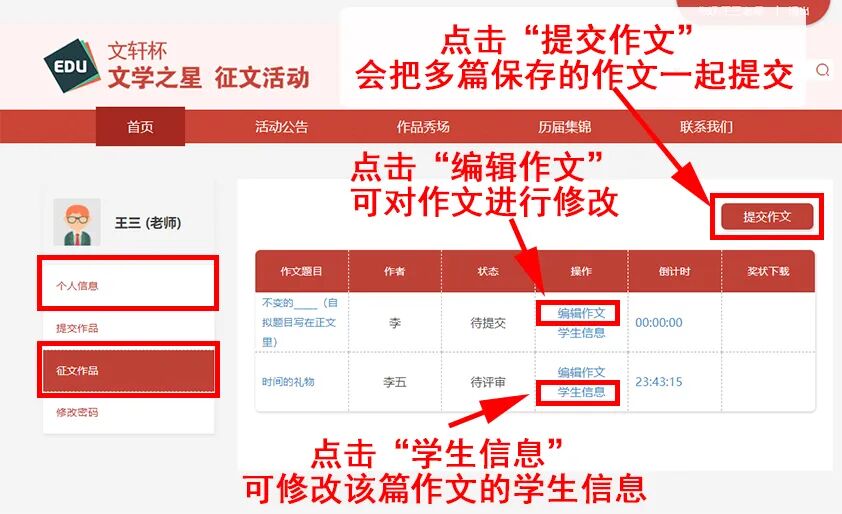 ★点击左侧菜单栏“征文作品”,查看已经上传的作文。点击蓝色小字“编辑作文”或“编辑”,可以对作文内容进行修改。点击“学生信息”或左侧菜单栏的“个人信息”,可以修改学生、老师等相关信息。