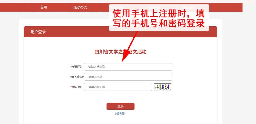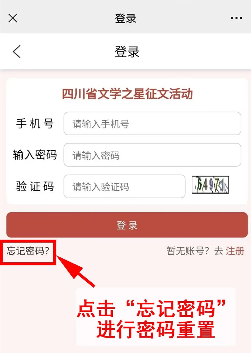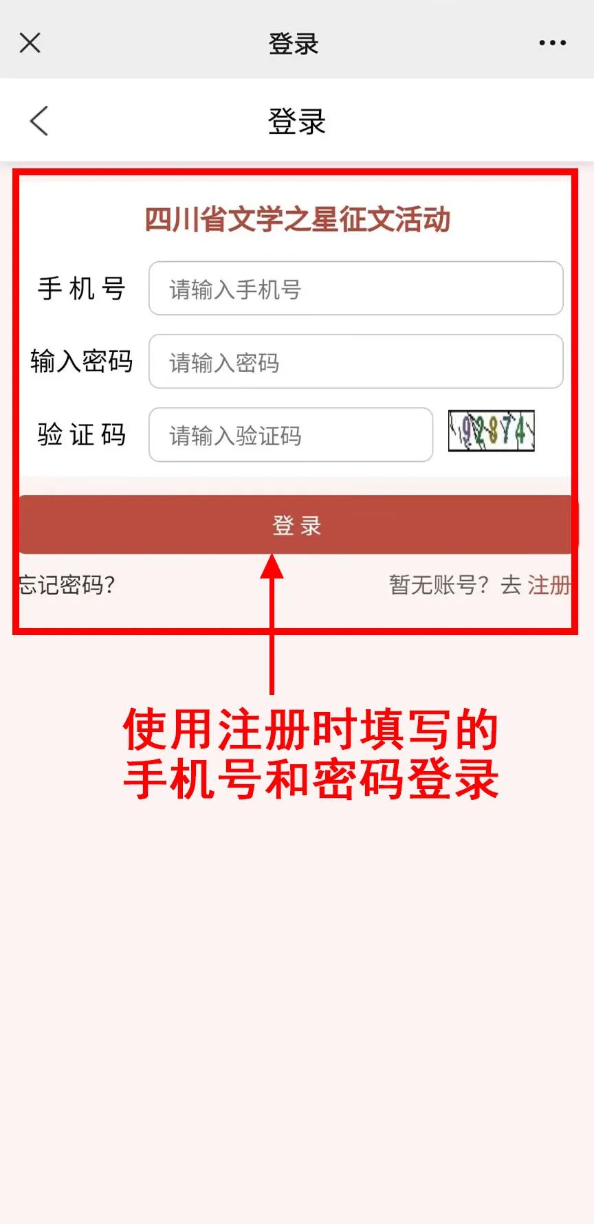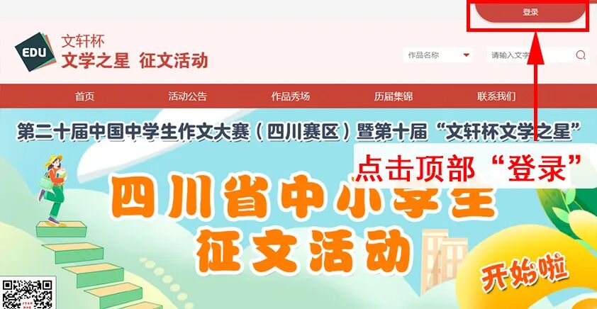 ★在电脑浏览器中,打开“四川文学之星”网站(wxzx.scedumedia.com),进入征文活动首页。点击首页顶部右侧的“登录”按钮,使用手机上注册时填写的手机号和密码登录。
