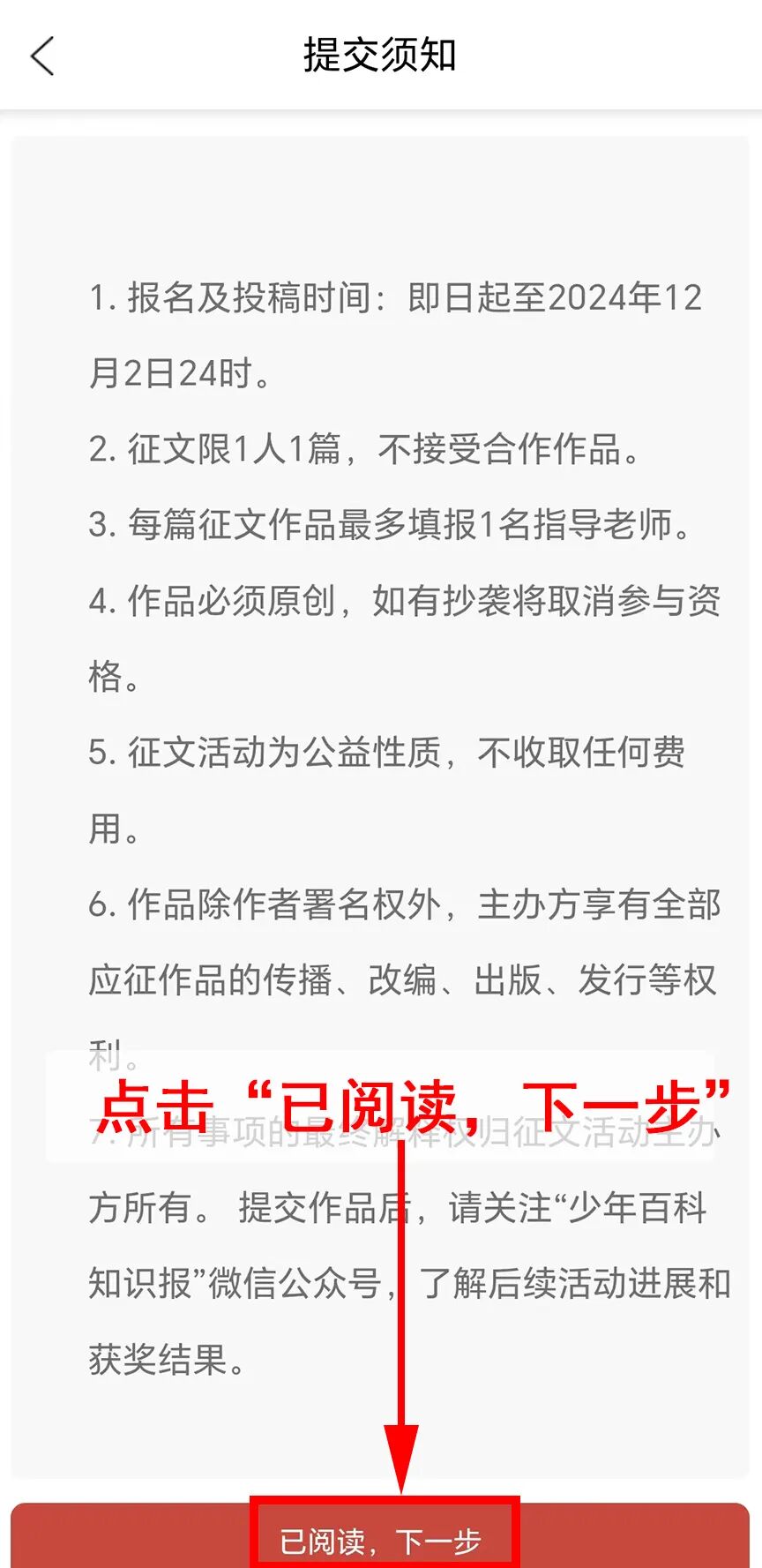 点击右上角红色三道杠,再点击“提交作品”,查看提交须知,并点击下方的“已阅读,下一步”。(教师账号为多位学生提交作文,也是重复此步骤。)