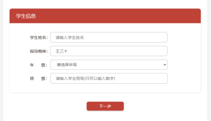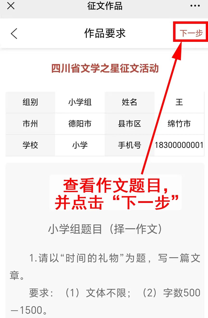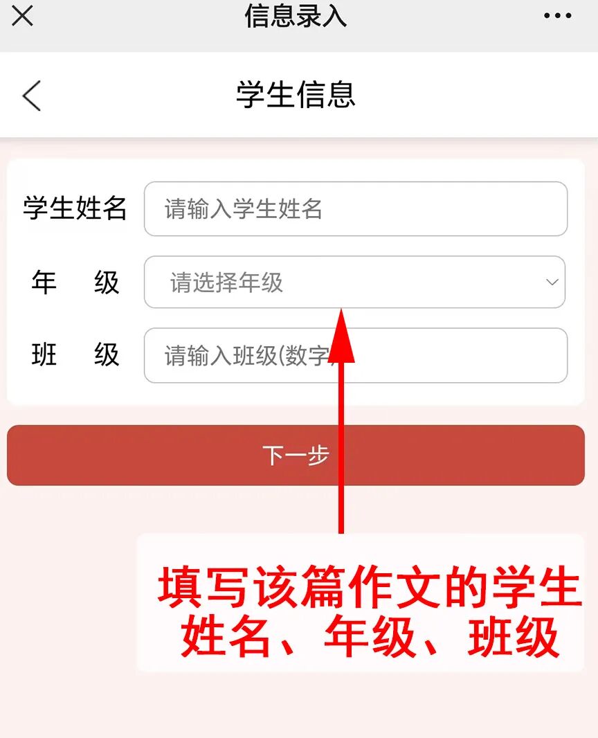 学生账号,填写指导老师姓名;教师账号,则填写该篇作文的学生姓名、年级、班级。查看作文题目,并点击“下一步”。