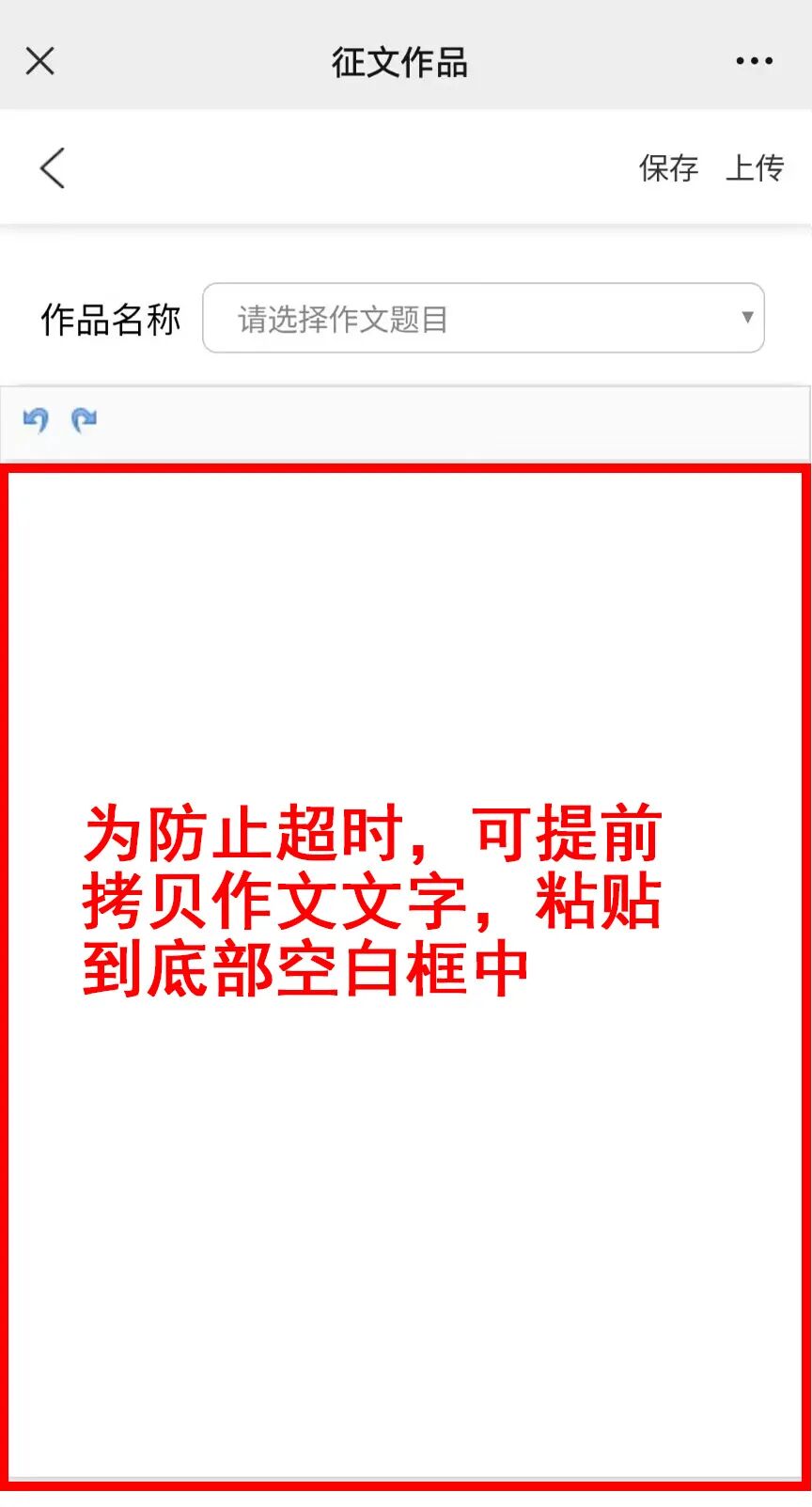 在“作品名称”下拉菜单中,选择作文题目。在底部空白框内输入作文正文,为节省时间,可提前准备好电子版作文文字,复制粘贴进去。不要在这个页面逐字输入作文,否则会超时。自拟题目的作文,请在正文内写上标题。