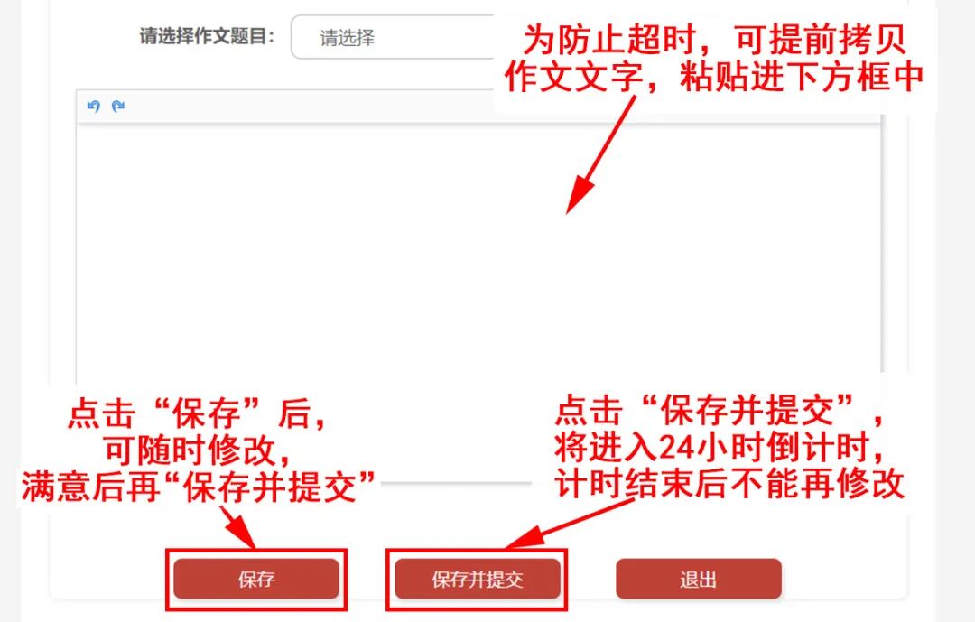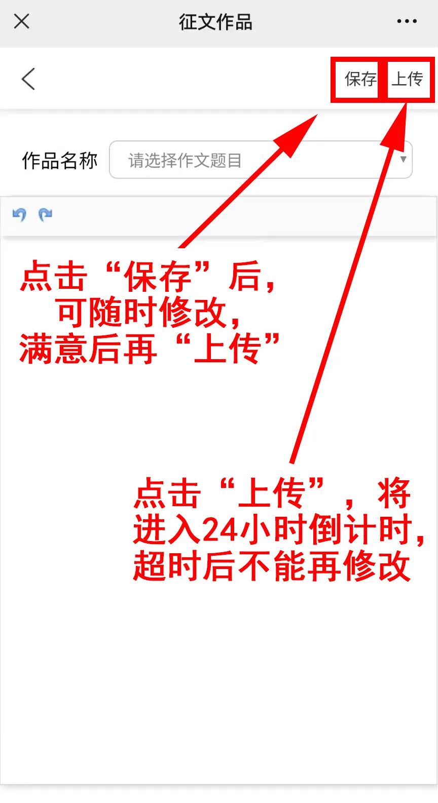 点击底部“保存”按钮后,可以随时进入征文系统对作文进行修改。修改满意后,再点击“保存并提交”,提交后将进入24小时倒计时,计时结束后不能再修改。