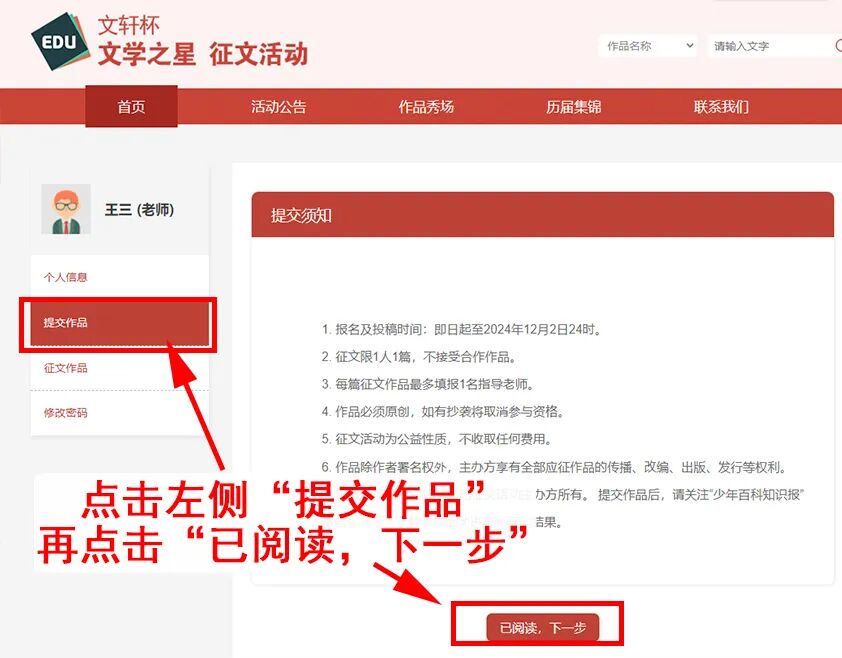★点击左侧菜单栏“提交作品”,再点击“已阅读,下一步”。