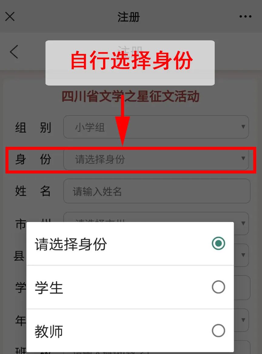 其中“身份”选择按钮,需要根据自己的实际情况选择身份。请注意,学生只能上传一篇作文(根据征文活动规则,无需重复上传或上传多篇);教师可以为多位学生上传作文,每位学生限一篇。