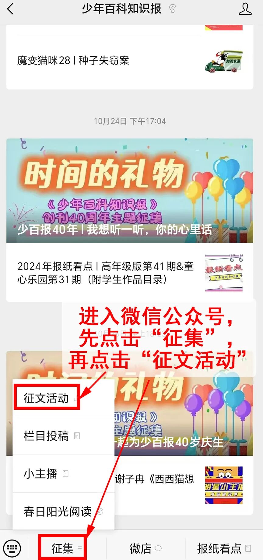 ①打开“少年百科知识报”微信公众号,在底部菜单栏点击“征集”,再点击“征文活动”,进入“四川文学之星”网站(wxzx.scedumedia.com)。