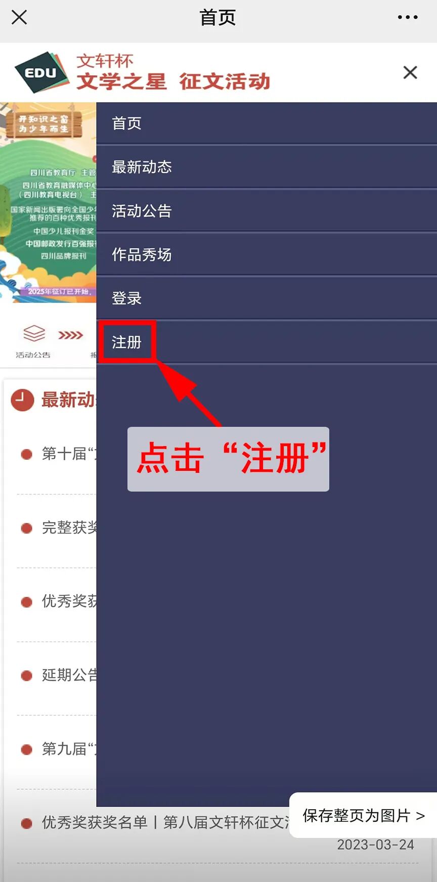②在四川文学之星网站首页,点击右上角红色三道杠,查找“注册”按钮。