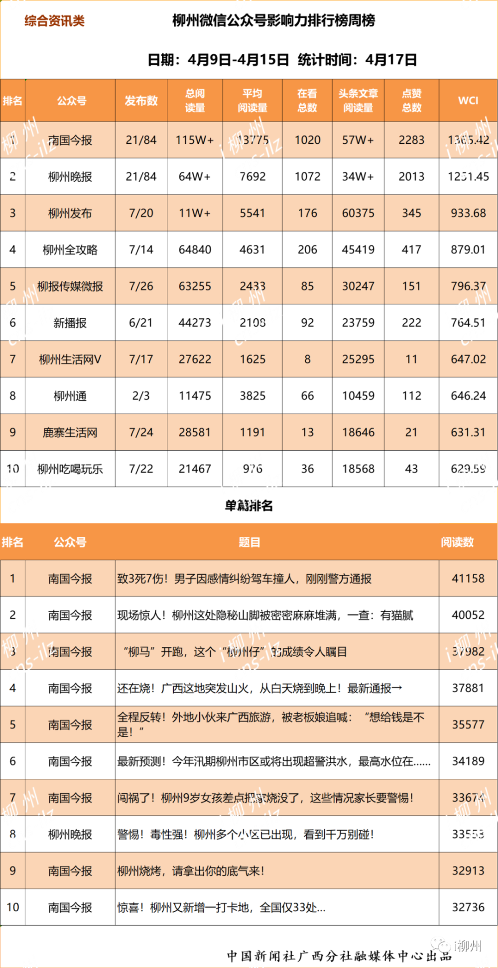 欢迎关注“柳州微信公众号影响力排行榜”。这是一个综合评估柳州本土微信公众平台传播力和影响力的榜单,由中国新闻社广西分社融媒体中心出品,秉承独立、公正、专业的媒体素养,并特邀业界学界人士担任顾问,每周权威发布。