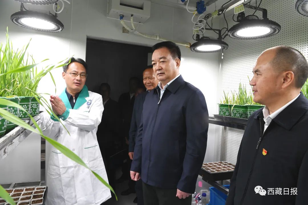 6月28日,自治区党委书记王君正来到自治区农牧科学院调研。这是王君正在省部共建青稞和牦牛种质资源与遗传改良国家重点实验室智能人工气候室,详细了解青稞育种繁育科研情况。记者 李洲 摄