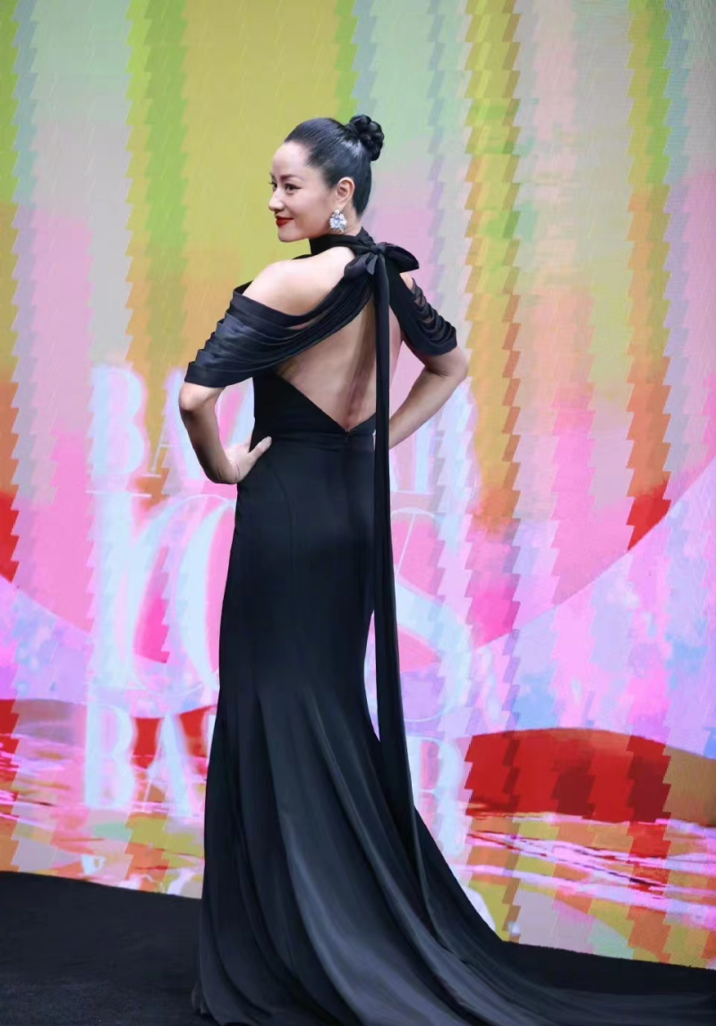 营口也是打破了常规的设计,彰显出时尚的特点,没有了黑色裙装的中规中矩,增添了视觉效果,弥补了全身黑色的单调感。而服装采用了后背镂空的设计,增添了时尚元素,很贴合现如今明星的身份,让黑色的裙装表达不再普通。在背后又增加了蝴蝶结的设计,造型有了很大的延伸,在成熟的魅力之上增加了不少甜美感,造型别具风味。