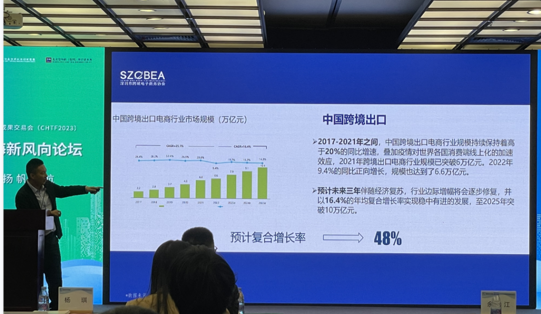 11月18日,第二十五届中国国际高新技术成果交易会——2023数字出海新风向论坛成功举办。本次论坛由深圳市工业和信息化局指导,深圳市软件行业协会、深圳市信息技术应用创新联盟、北京德和衡律师事务所主办,21世纪经济报道、匠新中日加速平台Takumi Innovation Accelerator、AroundDeal、e-works数字化企业协办,汉堡经济促进局、深圳市互联网文化市场协会、深圳市服务贸易协会、深圳市跨境电商协会、深圳市前海国际商事调解中心、深圳市前海一带一路法律服务联合会、深圳欧税通技术有限公司支持。论坛旨在助力数字经济发展,护航数字经济相关企业平稳出海。北京德和衡(深圳)律师事务所主任温贵和发表致辞,阐述了当前德和衡涉外法律服务体系在全球与国内的战略布局,展示了德和衡当前从事境外法律服务的律师团队规模与团队资质等涉外人才建设成就,并与多个相关行业平台建立了内部研讨和外部交流机制,一站式、无边界搭建合作平台,拓展服务领域。此次论坛,深圳市跨境电子商务协会法律事业部秘书长张超受邀出席,在现场为大家带来《跨境电商的法律风险和防御措施》主题分享。张超秘书长解析了当前跨境电商行业发展现状,介绍了深圳市跨境电子商务协会的概况与服务体系。通过多个跨境电商海外发展风险案例探讨深跨协在跨境电商知识产权领域的应对方案,为相关企业搭建跨境电商服务平台,建立一站式纠纷解决的商事调解体系,整合行业资源优势,助力相关企业平稳发展。