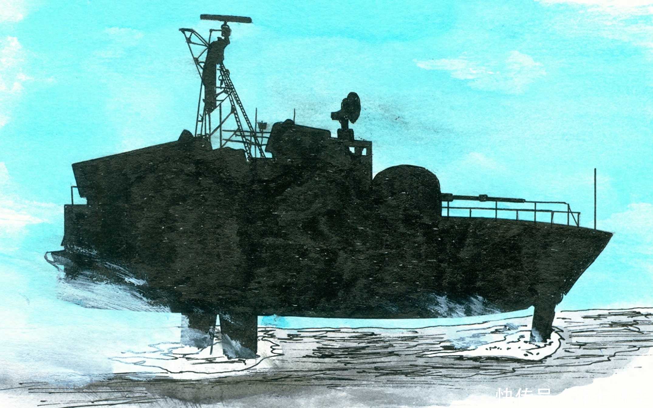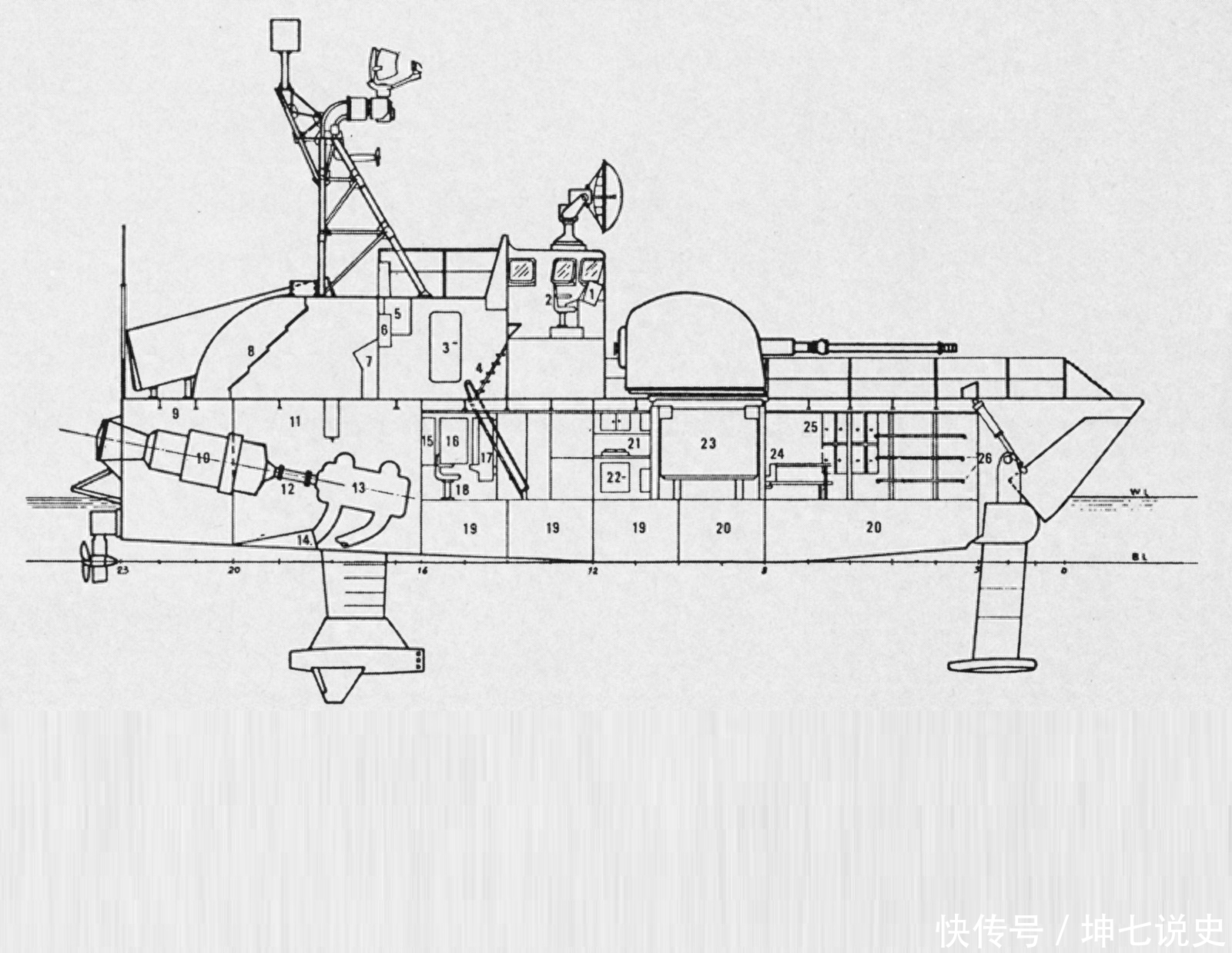 侧面视图,结构非常紧凑,整条船其实就是一门炮加两部反舰导弹发射架。