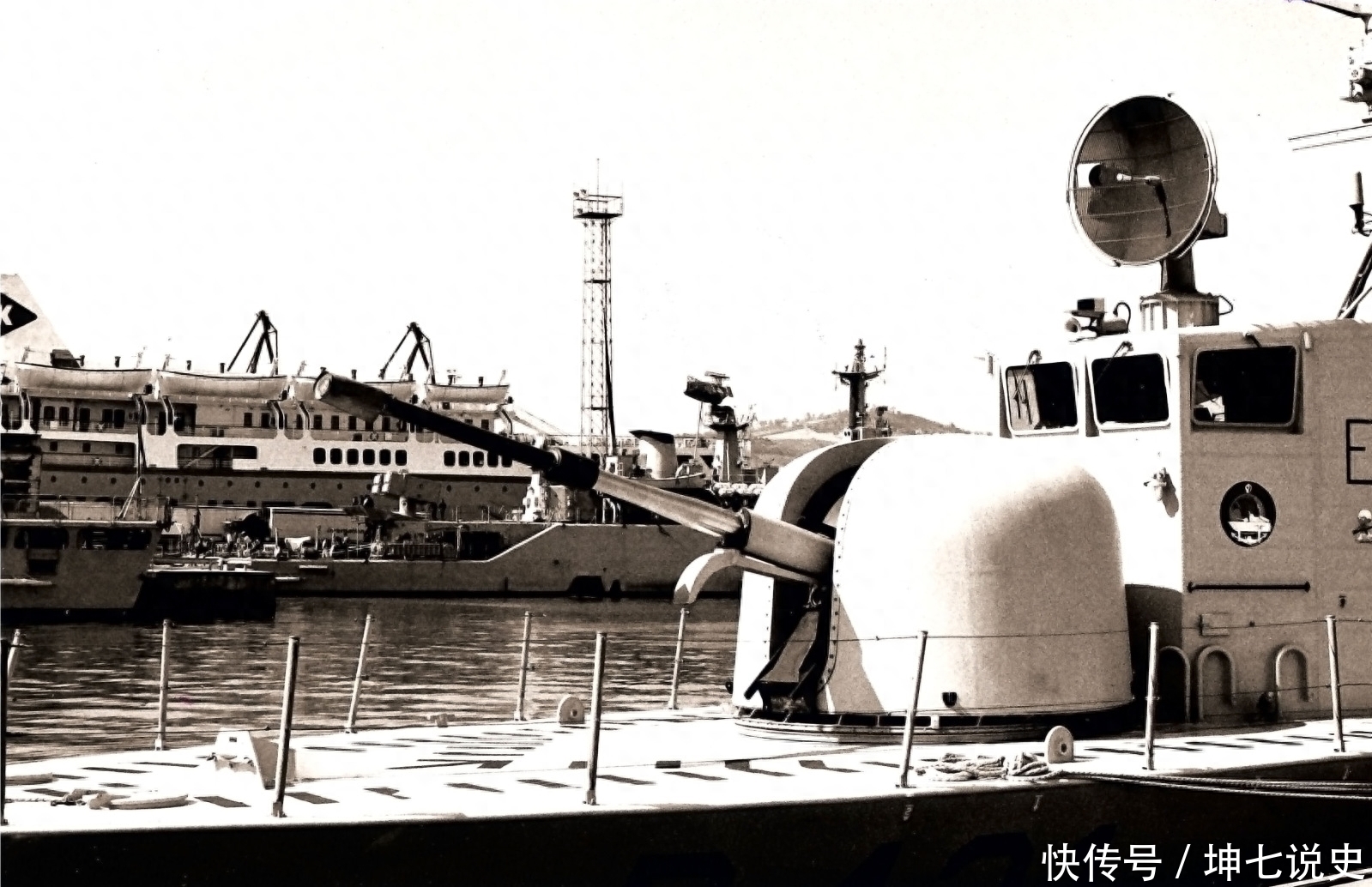 76毫米这种级别的火炮,一般都是安装在大型导弹艇、轻型护卫舰或者普通的护卫舰上的,安装在这种60吨的小艇上,显得非常的大。