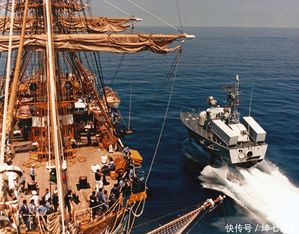 疾驰而过的鹞鹰级水翼导弹艇,旁边有条风帆训练舰。