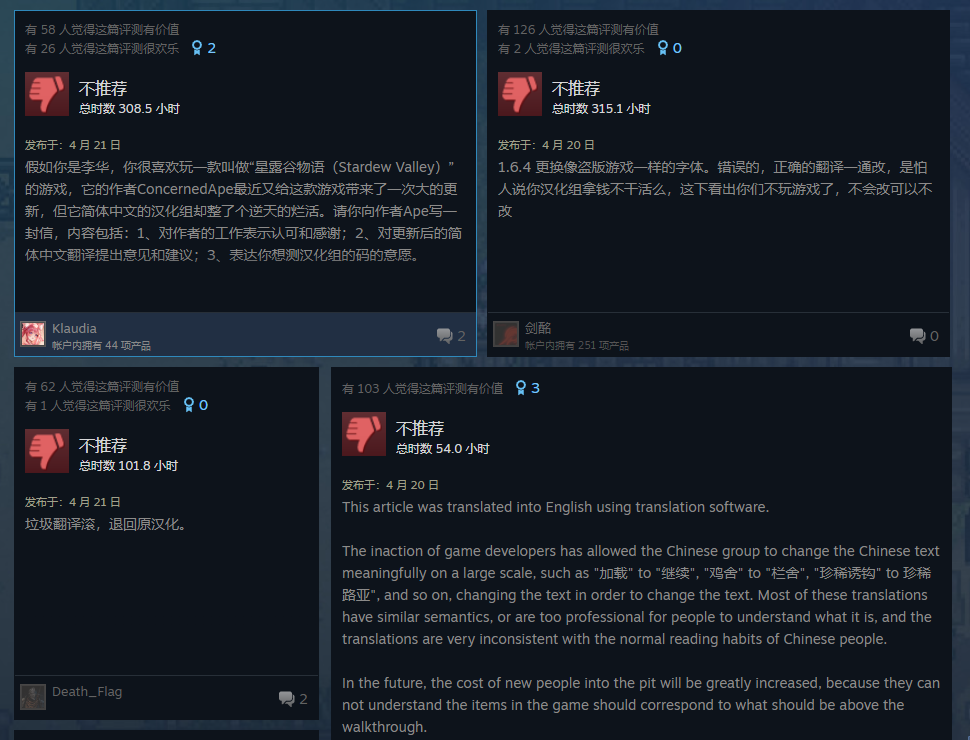 就在新版本的翻译引起争议的时候,有网友发现该翻译组的一位成员此前星露谷Wiki上发表了对原翻译的看法,认为之前的翻译存在“错翻、乱翻、抖机灵”等的情况。