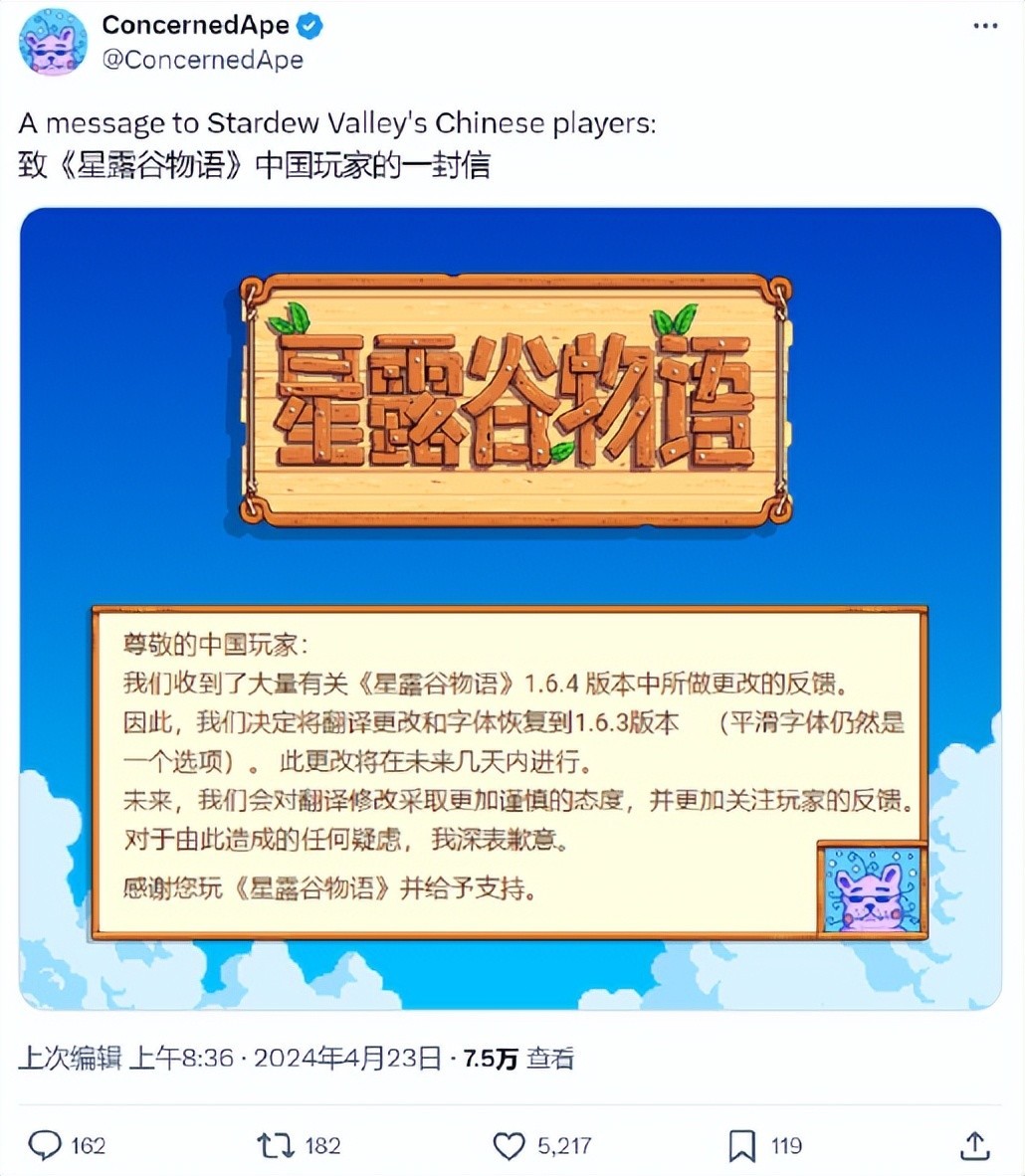 或许是看到了国内玩家对新版本翻译的怒火,4月23日,星露谷物语制作人用中文给国内的玩家致歉,表示将会把1.6.4更新的翻译和字体恢复到之前的版本(新字体仍可作为一个选项),并且会对翻译修改采取更加谨慎的态度。