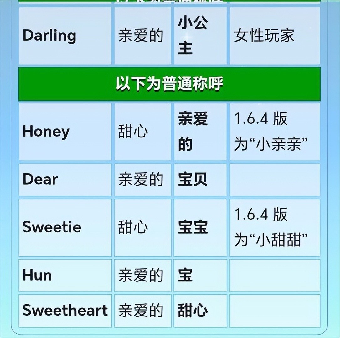 此外,游戏中NPC对玩家的普通称呼,以及配偶对玩家说的“特殊称呼”在新翻译中也做了不少的改动,像什么“亲爱的”变成了“小公主”、“宝”,甜心变为了“小亲亲”等等。