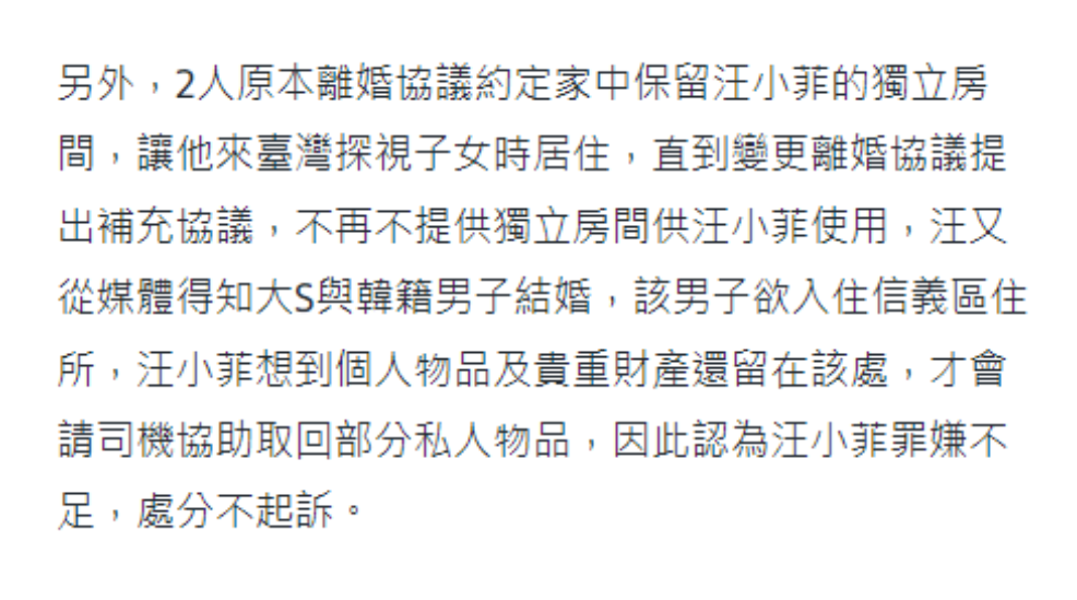 根据台媒报道,之前大S和汪小菲约定,即使两个人离婚之后,为了方便汪小菲来到台北看孩子,会在豪宅里为汪小菲留一间房间,也允许汪小菲之后有空随时来看孩子。不过,后来大S和具俊晔旧情重燃并决定闪婚之后,很快具俊晔就顺理成章住进了大S的豪宅里,汪小菲听说了之后感到不满。