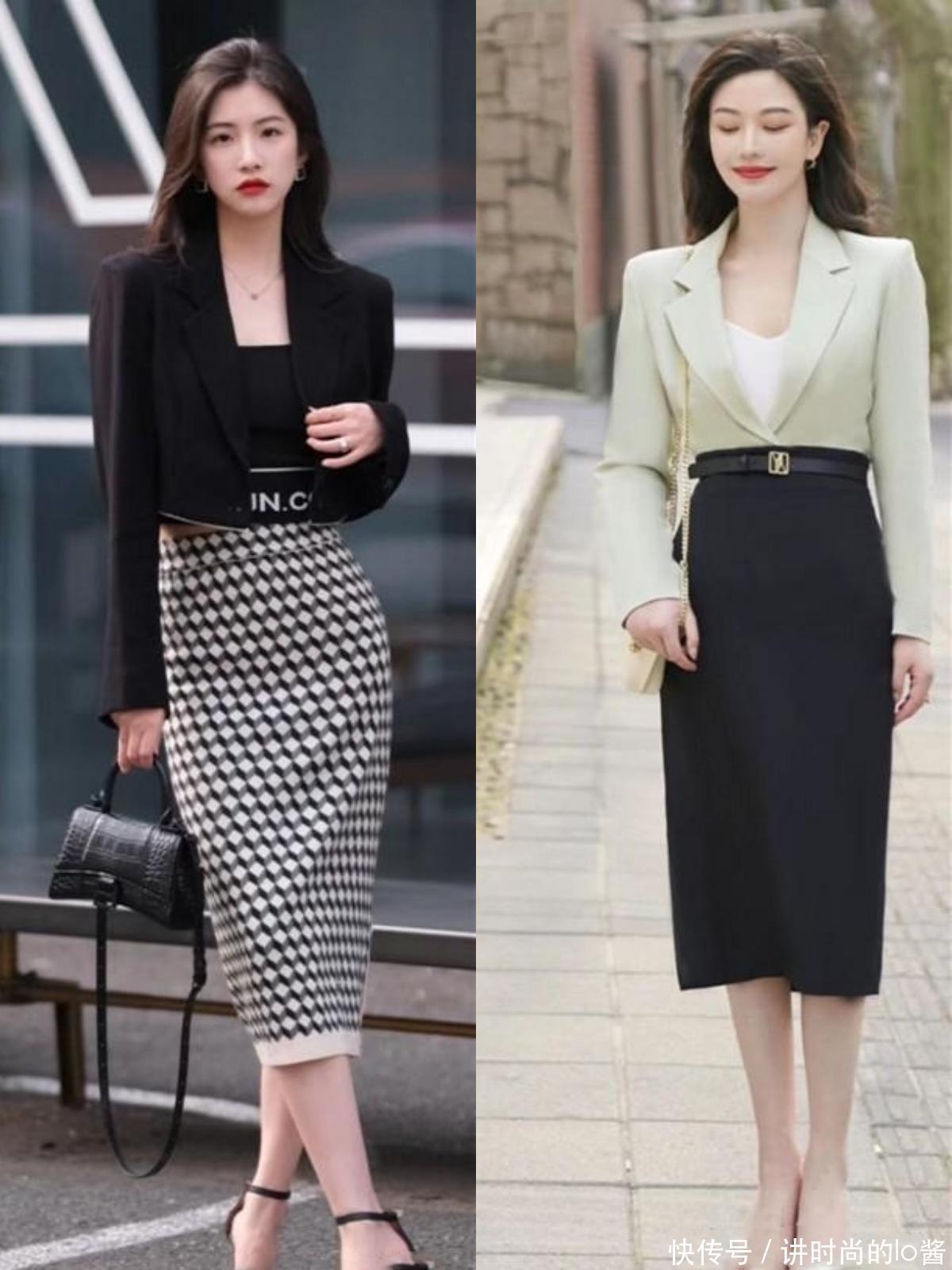 这种搭配方式适合重要商务洽谈或晚宴场合,展现出女性的专业与魅力。在色彩上,可以选择对比色搭配,如浅色短西装配黑色包臀裙,或是全身同色系打造冷静且连贯的视觉效果。