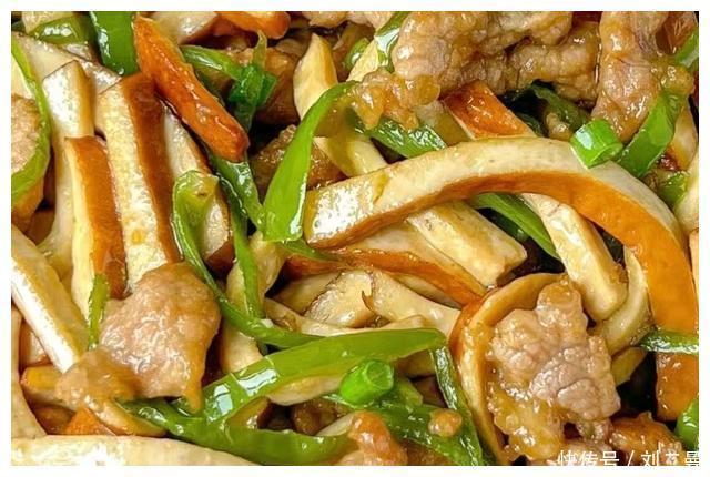 ?????? 4、再次起锅烧油,油热后放入青椒和豆干翻炒,炒至断生后,放入肉丝翻炒均匀,食材炒熟即可出锅装盘开吃。