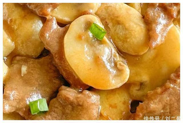 ?????? 4、起锅烧油,油热后放入蒜片炒香,再放入牛肉翻炒至变色,然后放入口蘑翻炒均匀。