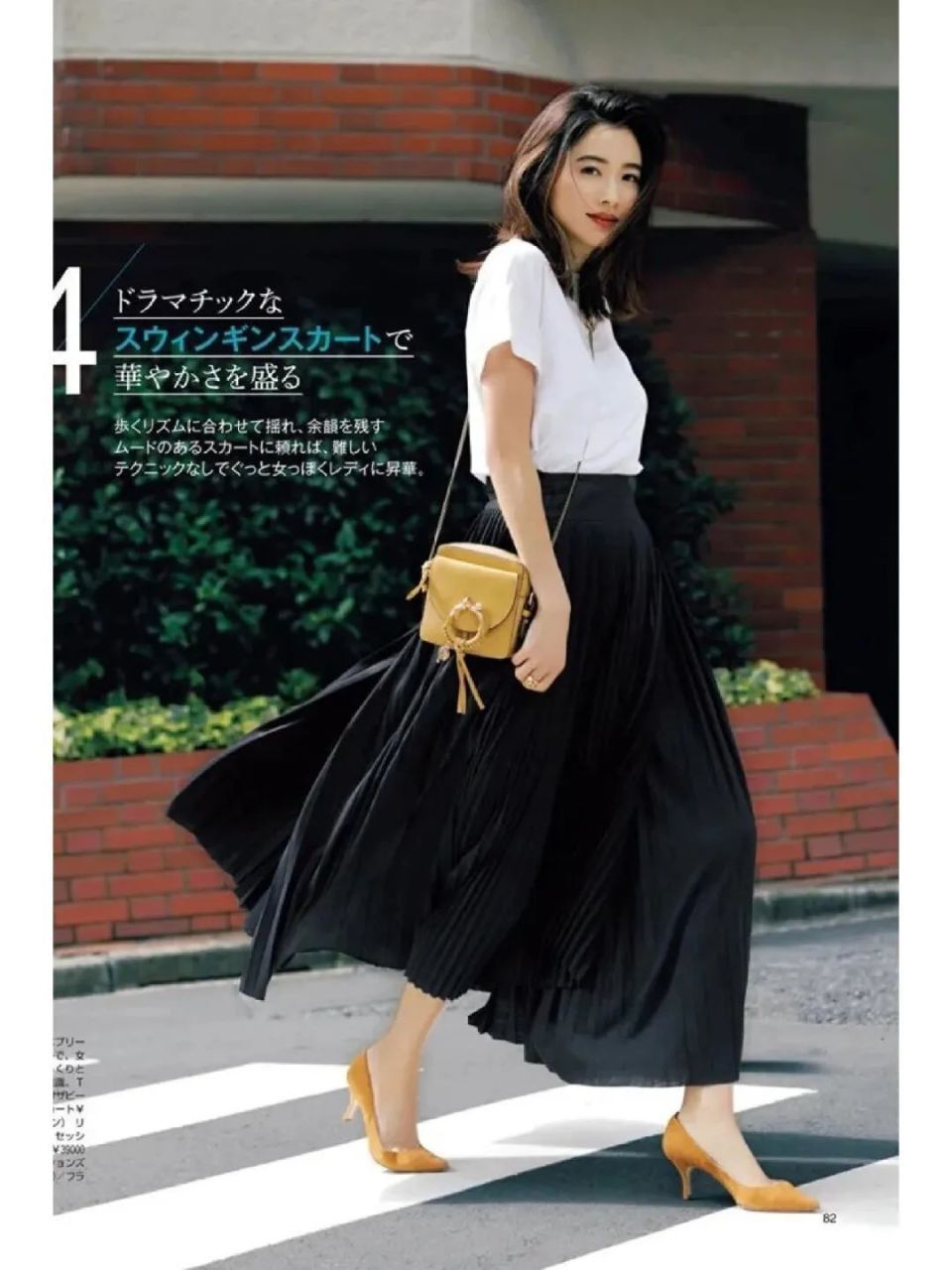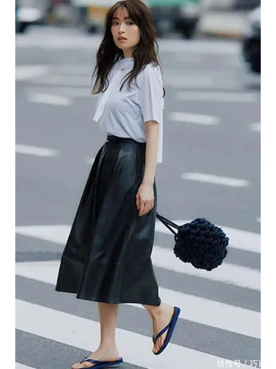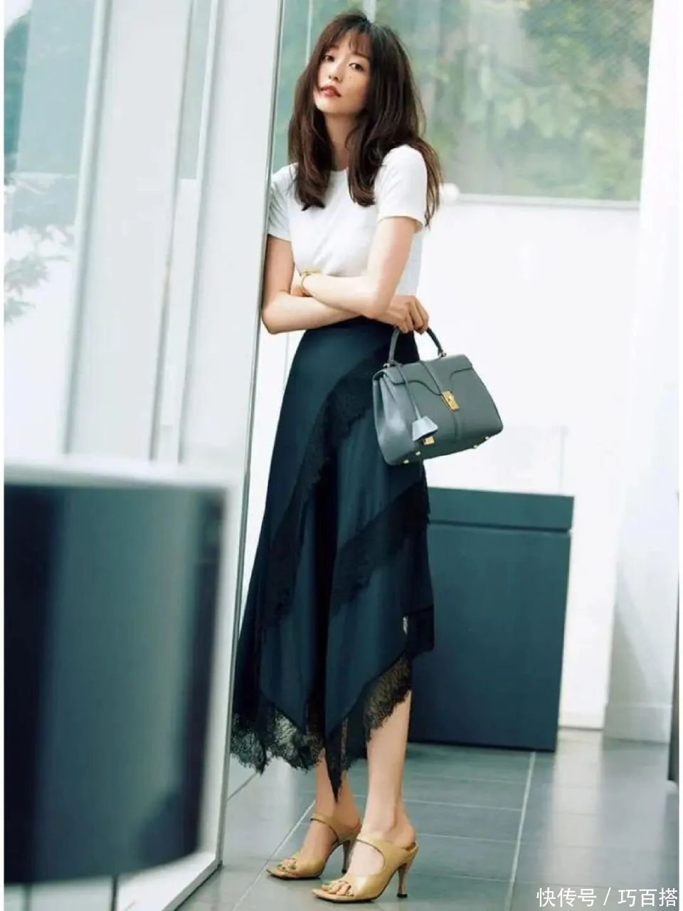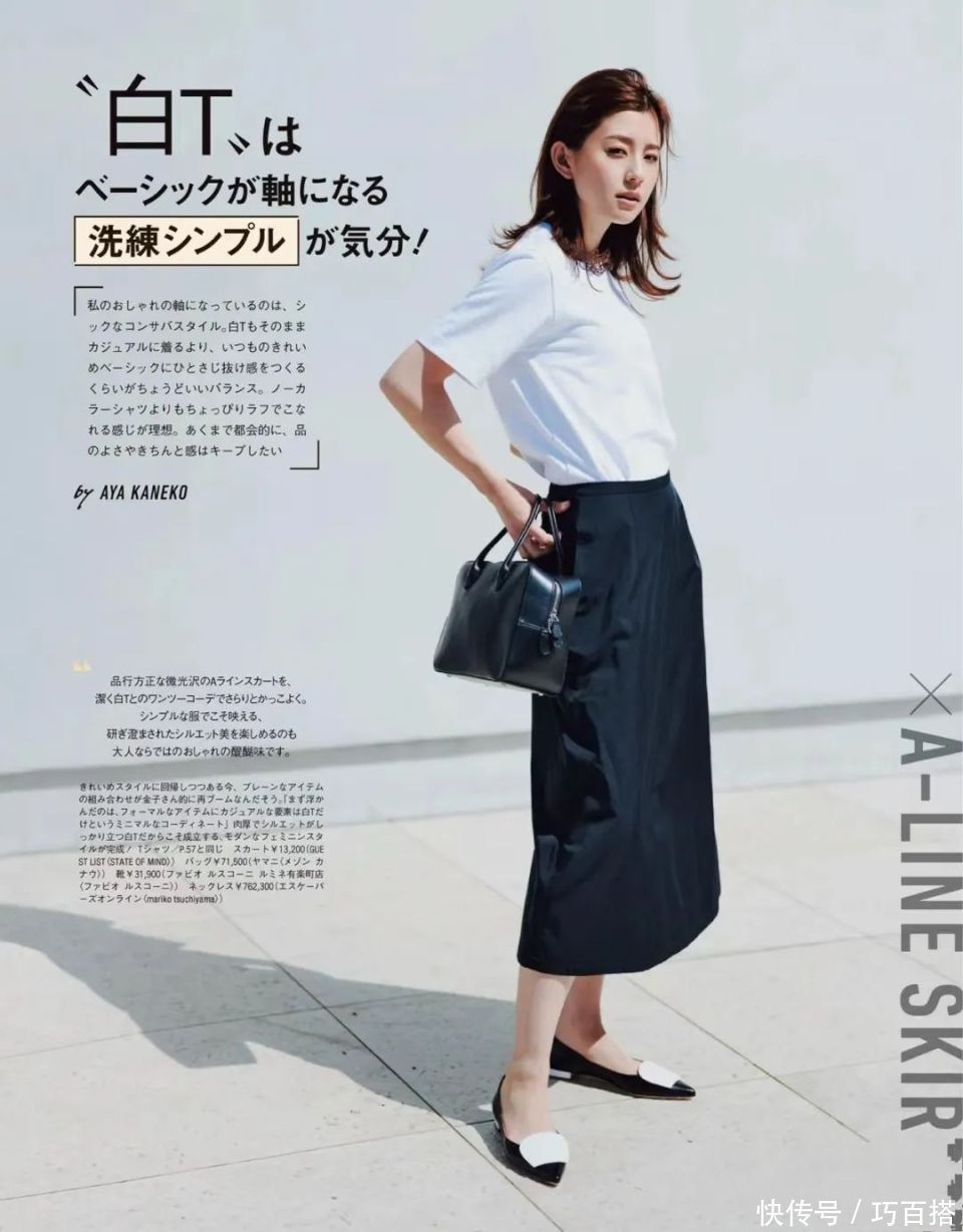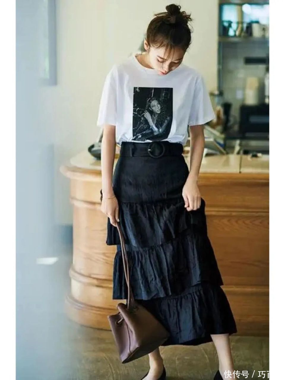 但如果大家换个思路,就不会出现以上问题了,修身白T恤+宽松小黑裙可以利用宽松度中和身材的不完美,对下半身线条扁平的女性来说,简直不要太友好,安全感满满!▼