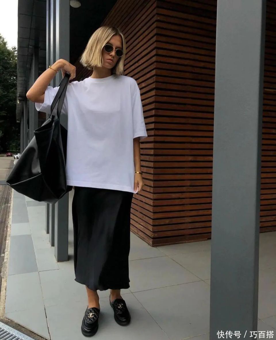 同样的道理,上半身线条不完美的姐妹选择宽松白T性价比更高,搭配修身小黑裙,松弛有度,慵懒有范,性价比超高!