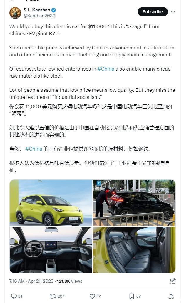 你肯定会说,啊中国的车子便宜,是因为人工便宜?当然不是啦,否则印度的车子将天下无敌了,他们表示,比亚迪海鸥之所以那么便宜,是因为中国有健全的产业链,以及垂直整合能力强。