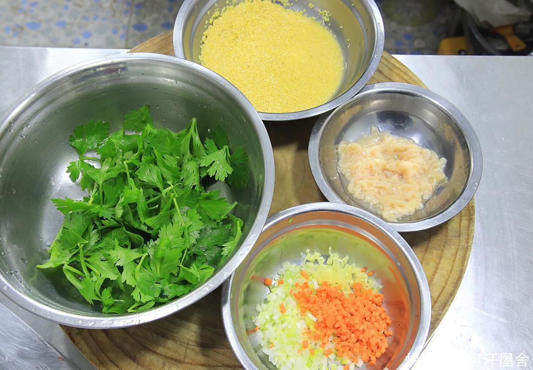 2.新鲜的芹菜一把,摘下一点嫩的芹菜叶,放在盆中清洗干净;生姜切成姜末、大葱白一段切成葱花、胡萝卜半根切成胡萝卜粒;再准备点鸡肉丝备用。