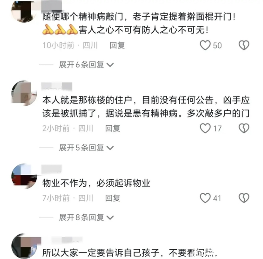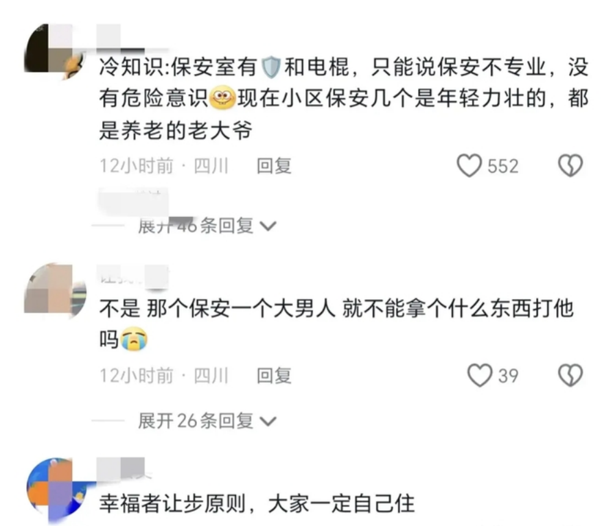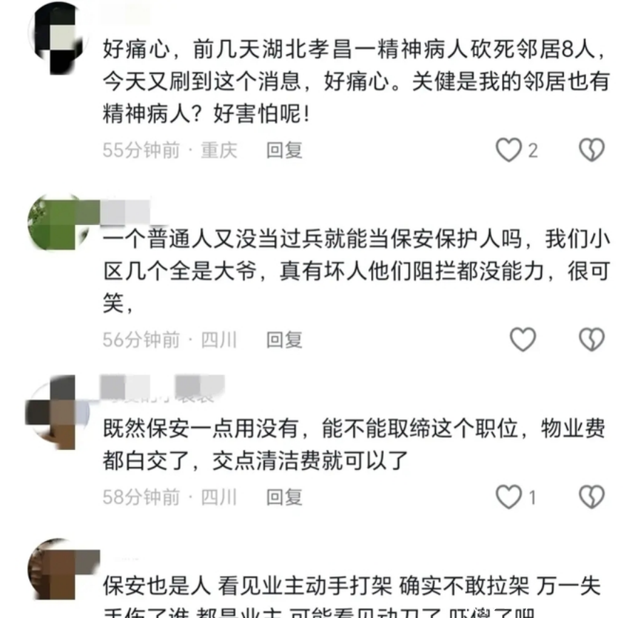 此外,有观众呼吁物业应该进行整顿,提高保安的素质和应对突发事件的能力。同时,也有人质疑精神病患者是否可以在没有监护人的情况下随意外出,这是否合理。