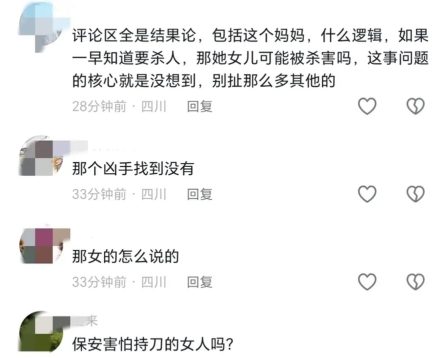 还有观众表示,保安可能因失职而被解雇,但考虑到他们的收入水平,很难要求他们冒生命危险。而且,许多保安年纪较大,面对陌生人敲门,最安全的做法是报警,而不是开门。即使保安没有武器,也应该尽力帮助受害者,比如使用扫帚或椅子作为防御工具。一位母亲因为女儿的不幸遭遇而深感悲痛和后悔,她曾多次与凶手面对面,却没想到女儿最终会遭遇这样的悲剧。