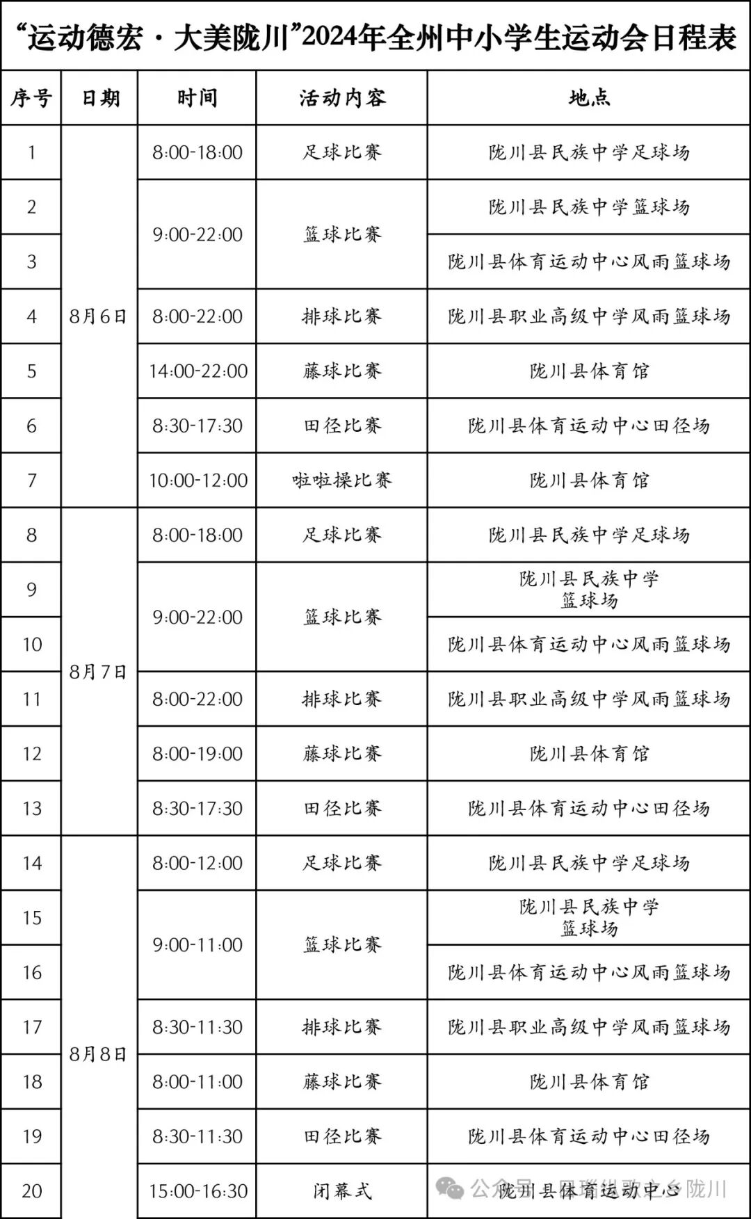 竞赛由初中组、小学组2个组别构成,竞赛项目有足球、篮球、排球、藤球、田径,啦啦操6个项目。此次运动会既是对全州学校体育工作的检阅,也是展示全州中学生体育风采和学生健康成长的一次盛会,必将持续推动全州学校体育运动广泛深入开展。