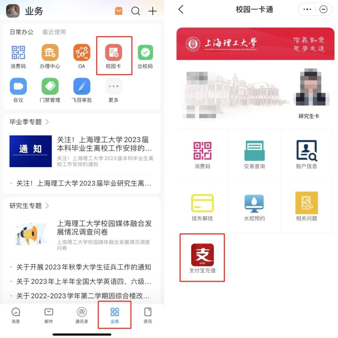 打开welink软件,点击“业务”栏目下的“校园卡充值”功能