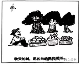 命题材料由漫画、配文两部分组成。立意时,要把漫画立意和话语倾向结合起来。“用果实说话”体现了结果的重要性,在画面中可以看到“各自的果实”,每棵树的果实不相同,体现出结果的差异性。审题的要点在于需将结果的重要性与差异性统一起来。我们评判事物要看到最终的结果,不能够华而不实,要用实力说话。同时,我们需要承认结果的差异性,看到个性的独特风采。如果审题时忽视结果的差异性,原则上不能超过48分。