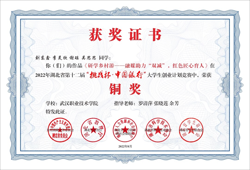 本专业共参加了4届“挑战杯”全国大学生竞赛,获得过湖北省一、二、三等奖项共18项。