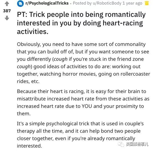 因为这个时候ta会心跳加速,而ta的大脑很容易会把这些活动带来的心跳加速张冠李戴到你身上,以为这是因为你和他的亲密行为带来的。